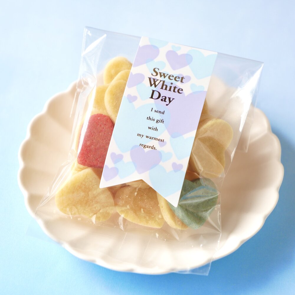 グルテンフリーの白のハートクッキーを基調に、淡いブルー、ピンクのハートクッキーを数枚入れた上品な love loveクッキーです。